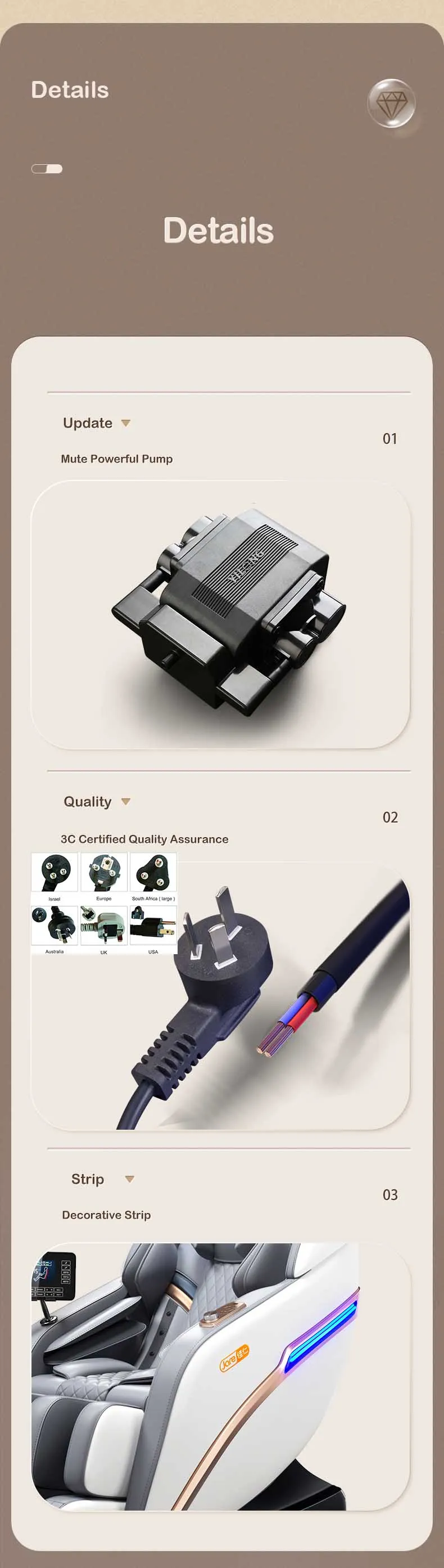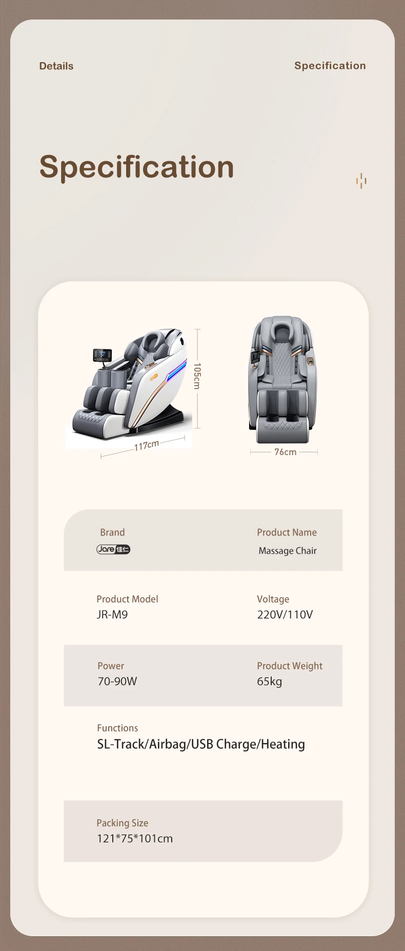 Model Number: JR-M9 Brand Name: JARE Origin: Mainland China Place of Origin: Fujian, China Type: Massage Chair Application: Full Body Function: Musical function After-sale Service: Free spare parts Feature 1: Blue-Tooth Music Feature 2: Fashion design Feature 3: Extend leg Heating function: Waist and Back Massage Modes: 4D Massages Certificate: CE .FCC.RoHS Material: ABS and PU Leather Warranty: 2 Year Related https://video.aliexpress-media.com/play/u/ae_sg_item/2400242241/p/1/e/6/t/10301/1100180709296.mp4