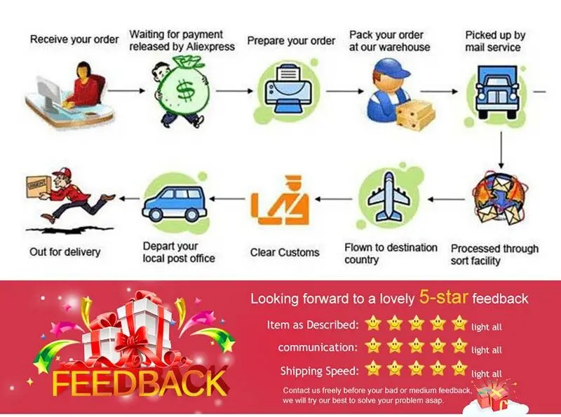 If you are satisfied with our products, Pls give us 5 Stars ,your 5 stars will inspire our work.Please leave 5 stars and positive feedback if you are satisfied with our products.If there are any problems with our items or products,please contacet us before you leave a negatie feedback.We will do our best to solve any problems